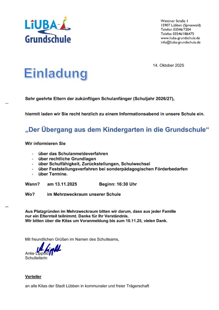 Ab dem 06.11.23 können Eltern über das Schulportal (https://schulportal.brandenburg.de/formulare-und-antraege/ue-1-verfahren) über ihre Adresse die für die Anmeldung zuständige Grundschule ermitteln, die Informationen zum schulpflichtig werdenden Kind ausfüllen und an die Schule übermitteln, sowie optional einen Termin zur Vorstellung des Kindes an der Schule auswählen und bei der Schule reservieren.